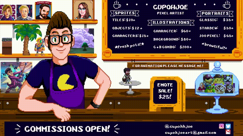 I’m Joe!I like creating art. I’ve grown to love pixels from all shapes and sizes, but the 8 & 16-bit era holds a special place in my heart.